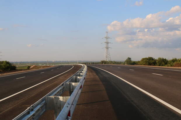 На данный момент осталось достроить участок длинной около 500 метров со стороны съезда на трассу Азов-Староминская — здесь предстоит еще уложить последние слои асфальта, установить ограждения и отбойники, нанести разметку и смонтировать мачты освещения. На большей части трассы все это уже сделано.
